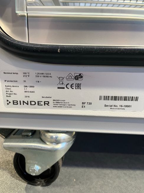 Binder BF-720 Incubator, SN: 16-18001, EST DIMS: , EST DIMS: 124x87x154, Weight: 207